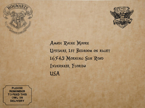Personalized 9"x12" - Envelope with Owl Post Stamp, Reminder to Feed the Owl on Delivery, Hogwarts Logo and Hogwarts wax seal to seal envelope.